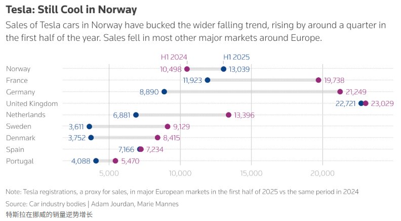 今年上半年,当特斯拉在德国、瑞典、丹麦和荷兰销量腰斩时,其在挪威却实现24%的同比增长,使该国跃居特斯拉欧洲第二大市场。