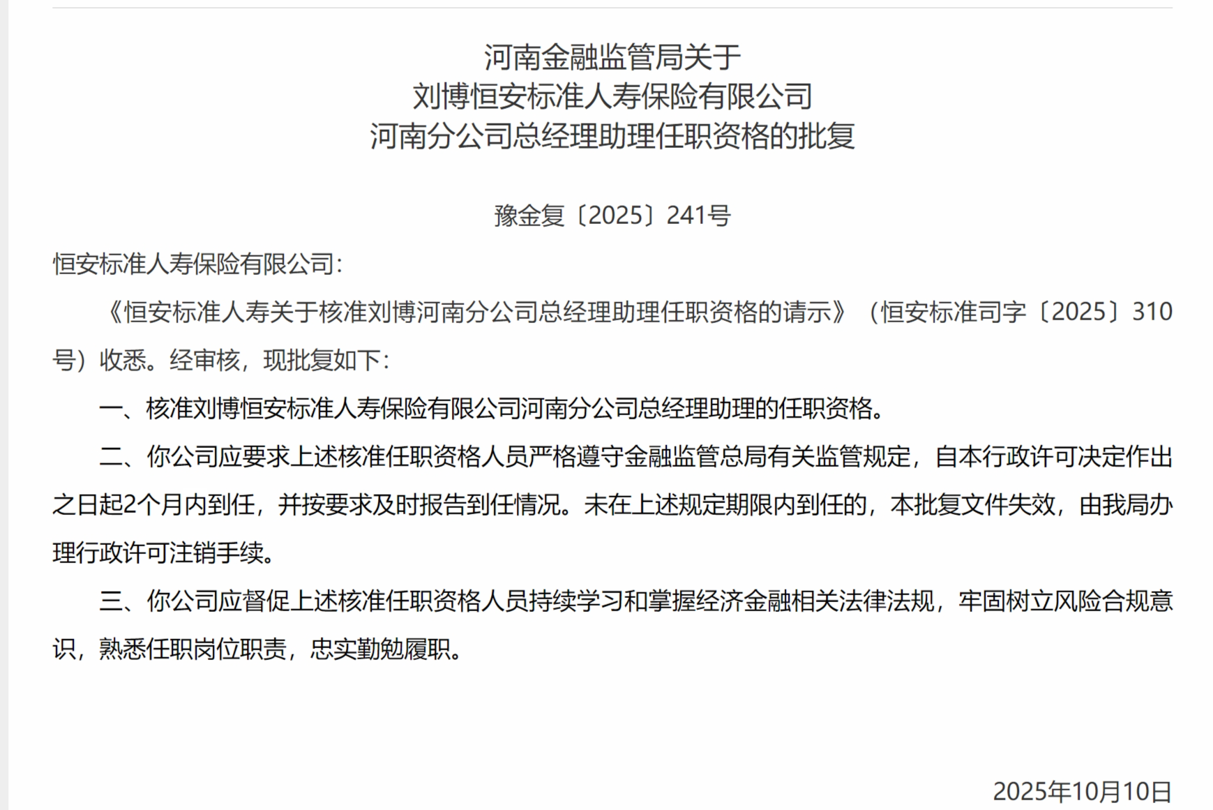 10月16日,河南金融监管局发布关于刘博恒安标准人寿保险有限公司河南分公司总经理助理任职资格的批复,核准刘博恒安标准人寿保险有限公司河南分公司总经理助理的任职资格。